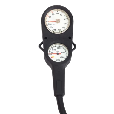 Heavy duty, not heavy weight. The Dive Rite 2-gauge console features the durability of a 2″ (5cm) diameter ‘brass and glass’ SPG. Using a Bourdon tube, the SPG is calibrated to 5000 psi in 100 psi increments (360 Bar in 10 Bar increments) for the highest level of accuracy.