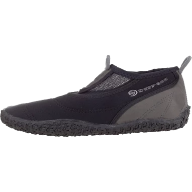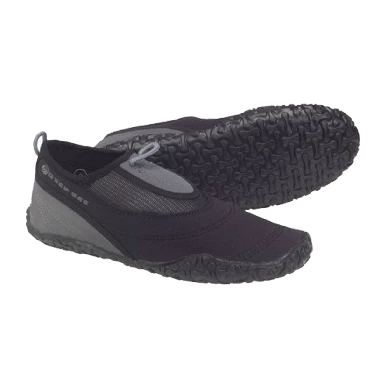 This light-weight water shoe is made from a closed cell rubber with mesh gusset and reinforced polysuede panels. The flexible non-slip rubber sole is non marking and provides excellent traction even on slippery surfaces. The shoe is a slip on style with finger loops and provides protection for warm water activities.