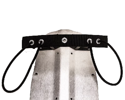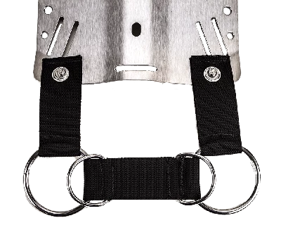 The Light Monkey bailout attachment system was designed with the “less is more” philosophy in mind. This compact and streamlined unit replaces the traditional rigid buttplate that is often difficult to reach with a back-mounted rebreather. The pliable webbing allows rebreathers to be set upright at the dive site without the risk of falling over, and the 2” D-rings are great for keeping spools and reels out of the way until needed. The design, utilizing two 3” stainless steel O-rings and a grommeted webbing bungee assembly, allows bailout, stage, or even sidemount bottles to be mounted in proper trim.
