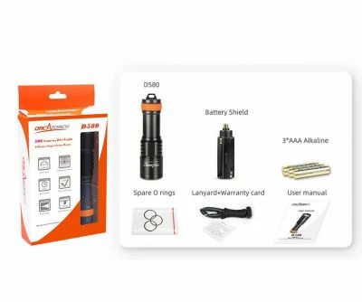 OrcaTorch D580 is a professional underwater dive light with max 530 lumens output. Mechanically head rotary switch offers high reliability underwater. The light is compatible with two types of batties: 1* 18650Li-ion rechargeable battery, which is economic and eco-friendly, and the 3*AAA Alkaline batteries, which is low cost and easy to get. It has 6 degrees super narrow beam, quite suitable for recreational diving as a primary light, and for technical diving as a backup light.