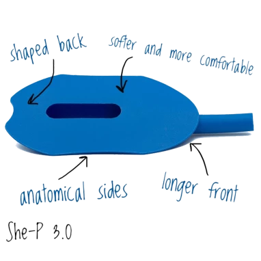 The She-P is a soft silicone device featuring a reservoir with output tube, that has flexible wings that are designed to be adhered to the skin. This results in a proper seal and comfortable urinating.