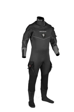 This neoprene drysuit is constructed using a method that creates a durable, comfortable interior seam that’s easier to repair and reduces cost. The suit has a long chest zipper for easy self- donning, and a pair of roomy cargo pockets. It has a comfortable neoprene neck seal and zippered wrists for easy entry and streamlining.
