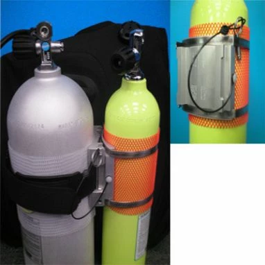 Attachment is accomplished simply by interlocking the two-piece bracket with a vertical movement. When it bottoms the attachment holds itself in place while the locking pins are installed. The bracket is dedicated to your BCD. This eliminates the need to install brackets on all of your main tanks. This design concept allows you to use rental tanks without attaching brackets to them.