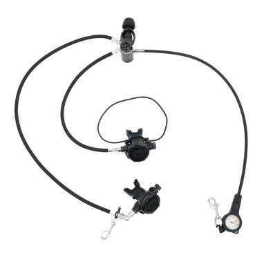 The XT1 First Stage’s fixed turret design and flat LP and HP ports allow hoses to run straight out from the side of the regulator for more streamlined hose routing. The primary second stage is routed under the divers arm on a 40″ flex hose with an angled adapter. This routing keeps the hose from flaring out and the longer hose allows for comfortable air sharing in an emergency situation. The backup second stage is on a 22″ flex hose with necklace to be quickly accessed if needed. The high-quality Mini Tech 2″ Brass SPG is on a 30″ flex hose with boot and stainless clip to be attached on the waist or chest D-ring for easy viewing.