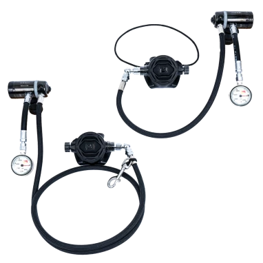 – (2) Right-Handed XT4 2nd Stages, one on a 22″ LP hose coming off the right regulator and an 84″ LP Hose coming off of the left cylinder.